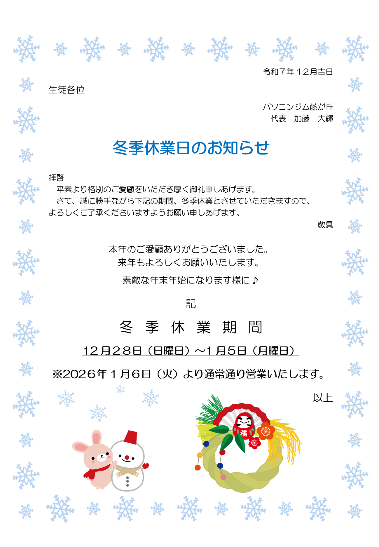 さて、誠に勝手ながら12月28日(日)から1月5日(月)まで冬季休業とさせていただきます。